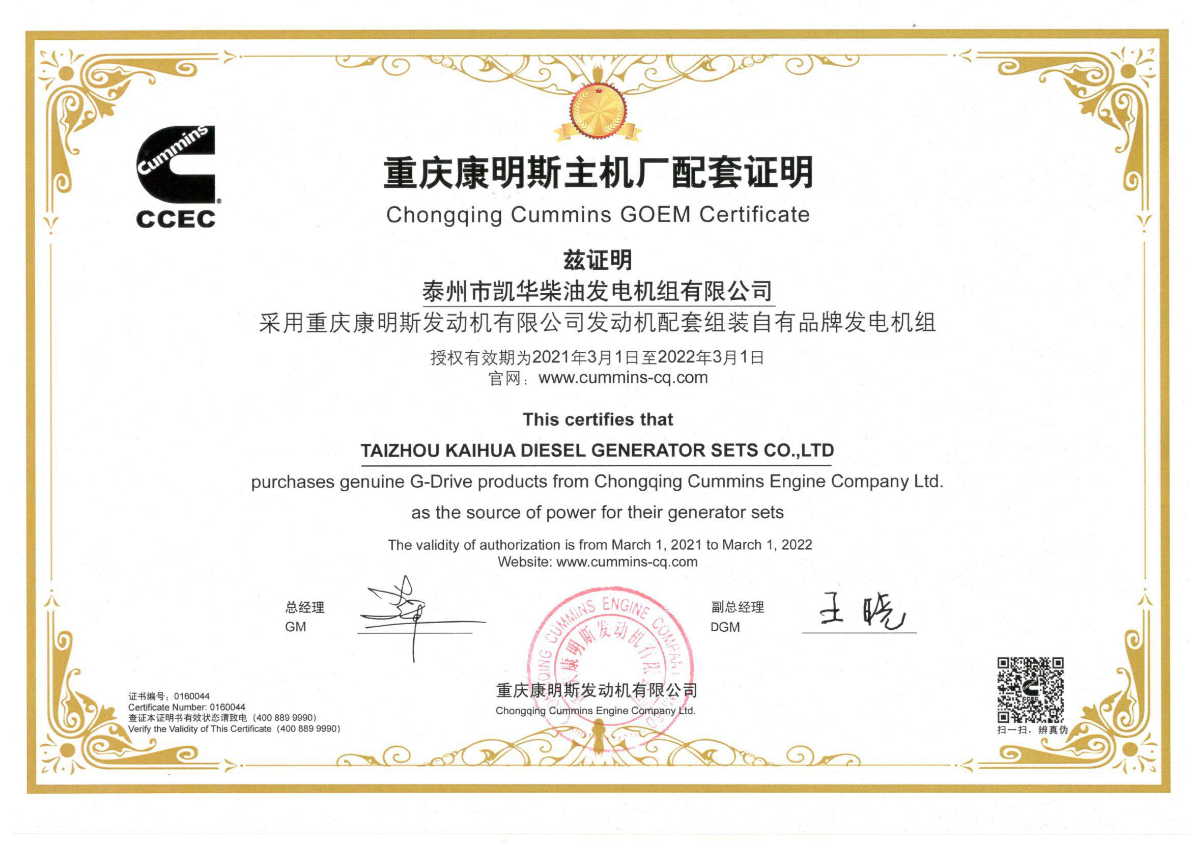 公司主營產品:3~3000KW陸用柴油發(fā)電機組,15~600KW移動拖車電站,12~1000KW船用應急柴油發(fā)電機組,各種靜音型、中高壓、多機并聯(lián)、燃氣等特種機組以及進口系列柴油發(fā)電機組,可滿足不同客戶的一切電力需求,還可滿足用戶不同電壓、不同頻率的要求。凱華公司是康明斯品牌的授權代理商,專業(yè)生產供應康明斯柴油發(fā)電機組。